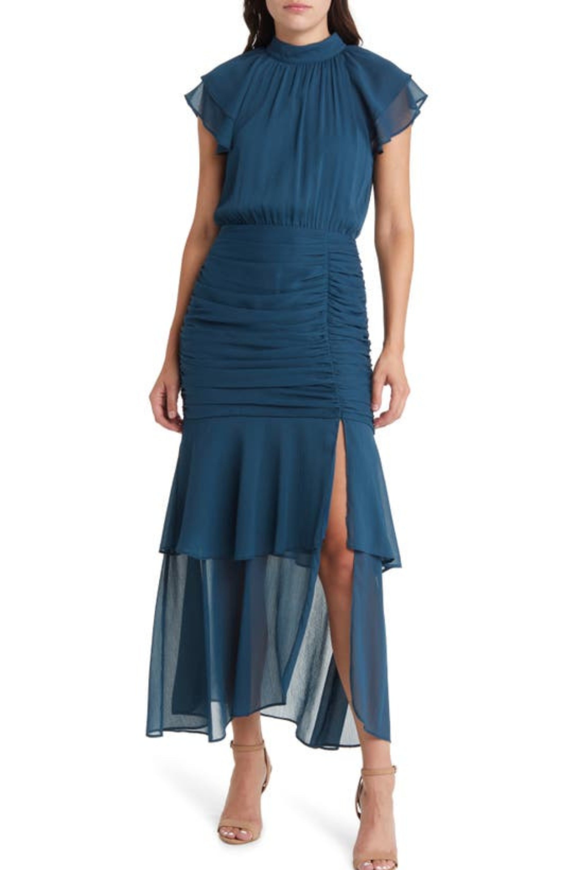 Blue Satin Sleeveless Mock Neck Maxi Dress