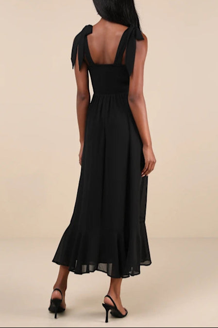 Summer Invite Black Tie-Strap Tiered Midi Dress