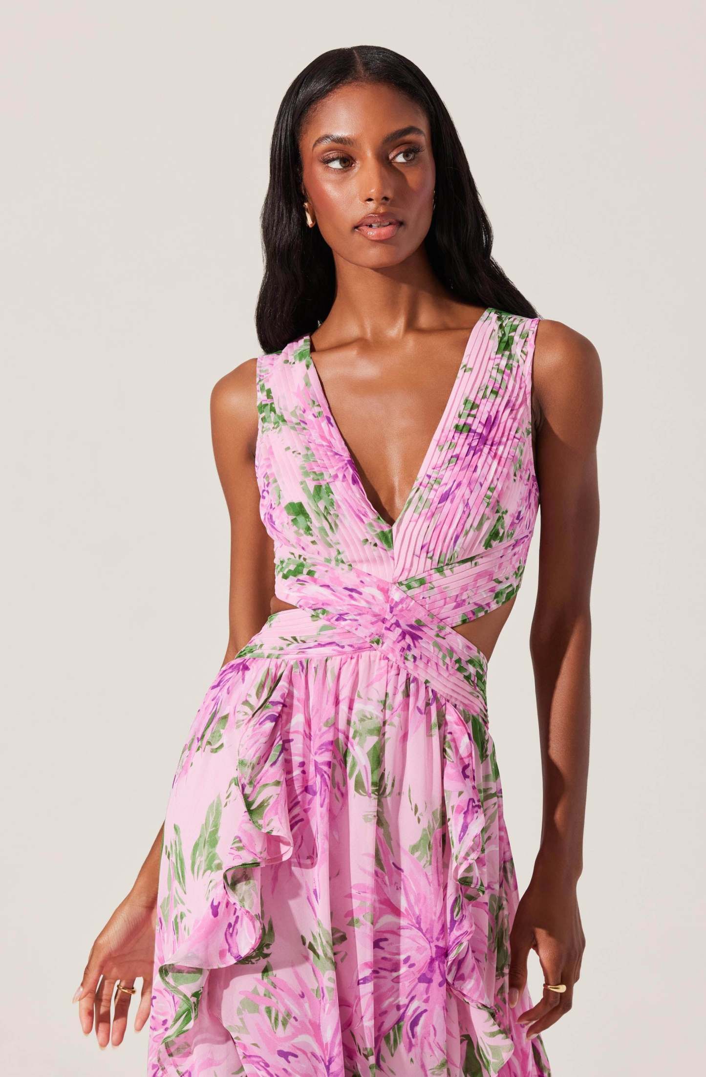 Elevate your wardrobe with the Alyssa Ruffle Floral Cutout Maxi Dress in pink. Expertly designed, this dress features delicate floral patterns and subtle cutouts that add a modern edge to its classic maxi silhouette. The ruffle details enhance movement and femininity, making it perfect for both elegant occasions and stylish daytime events. Crafted to flatter, it offers a comfortable yet refined fit that highlights your natural shape with sophistication.