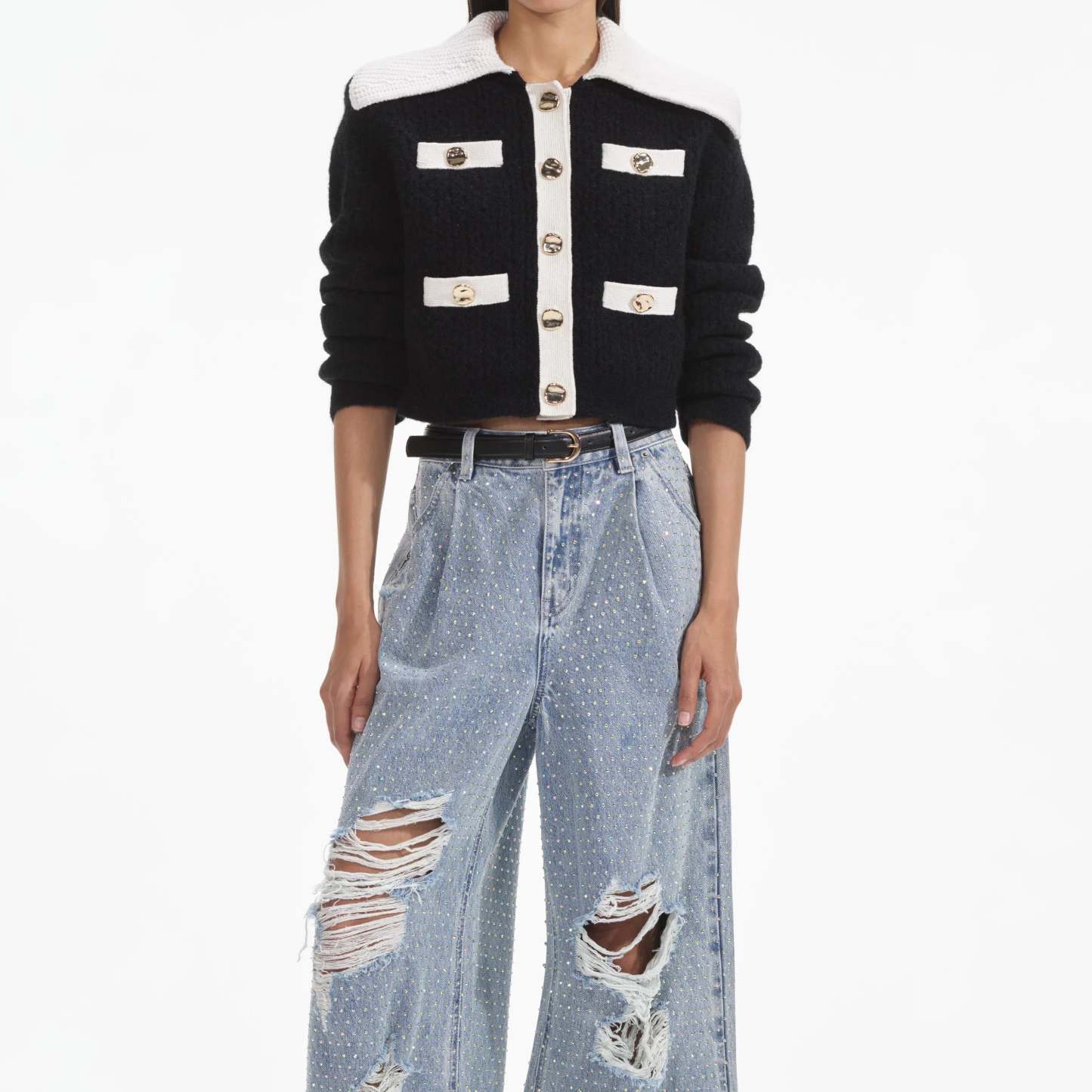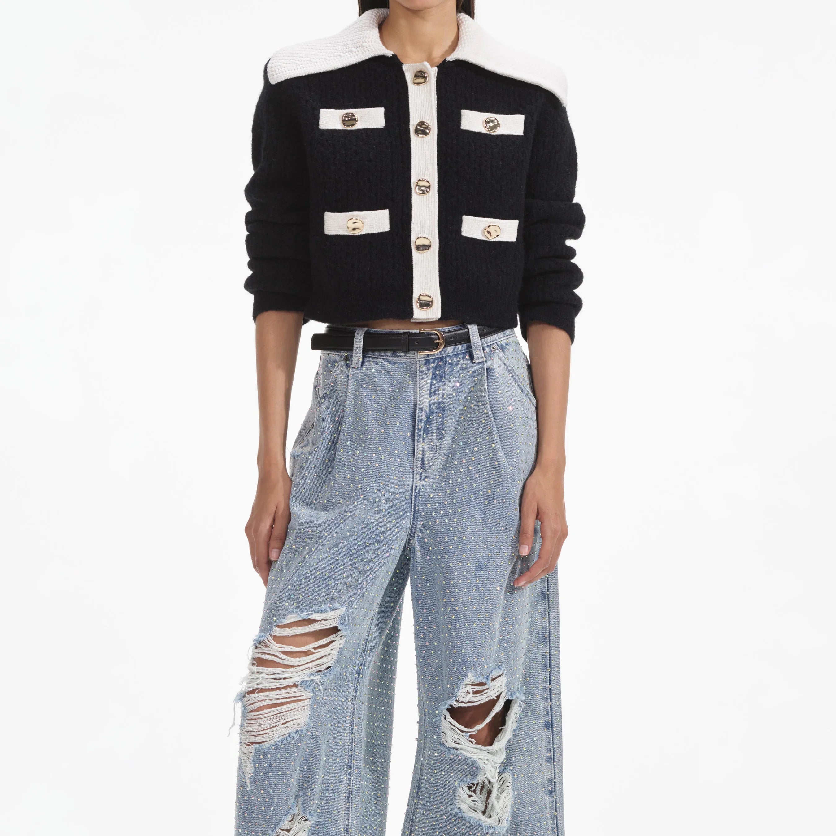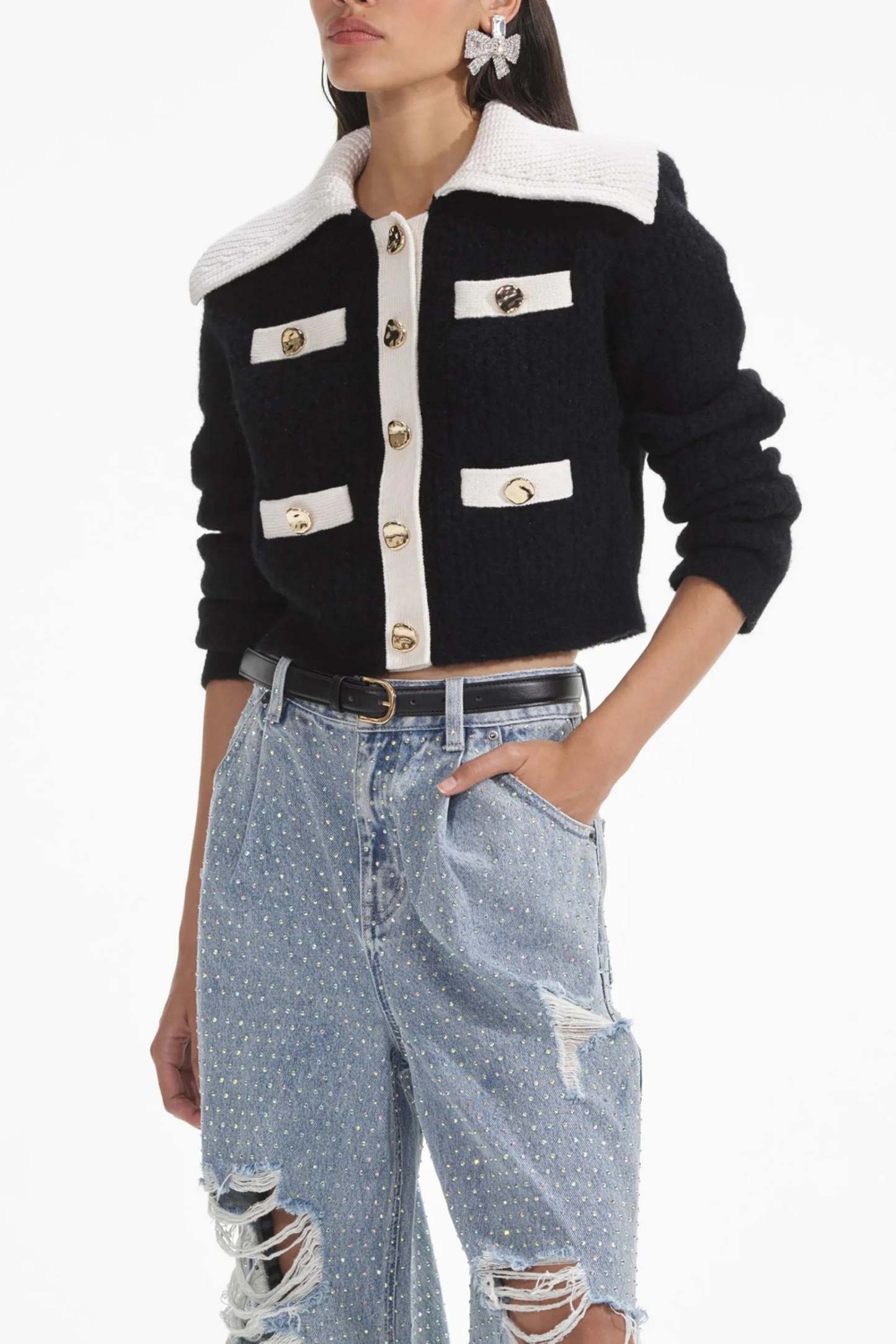 Preppy and polished with a playful spin, this lush cashmere blend cardigan stars a statement collar and ultra-flattering cropped cut. Match its gold buttons with our statement earrings for an effortless desk-to-dinner look.