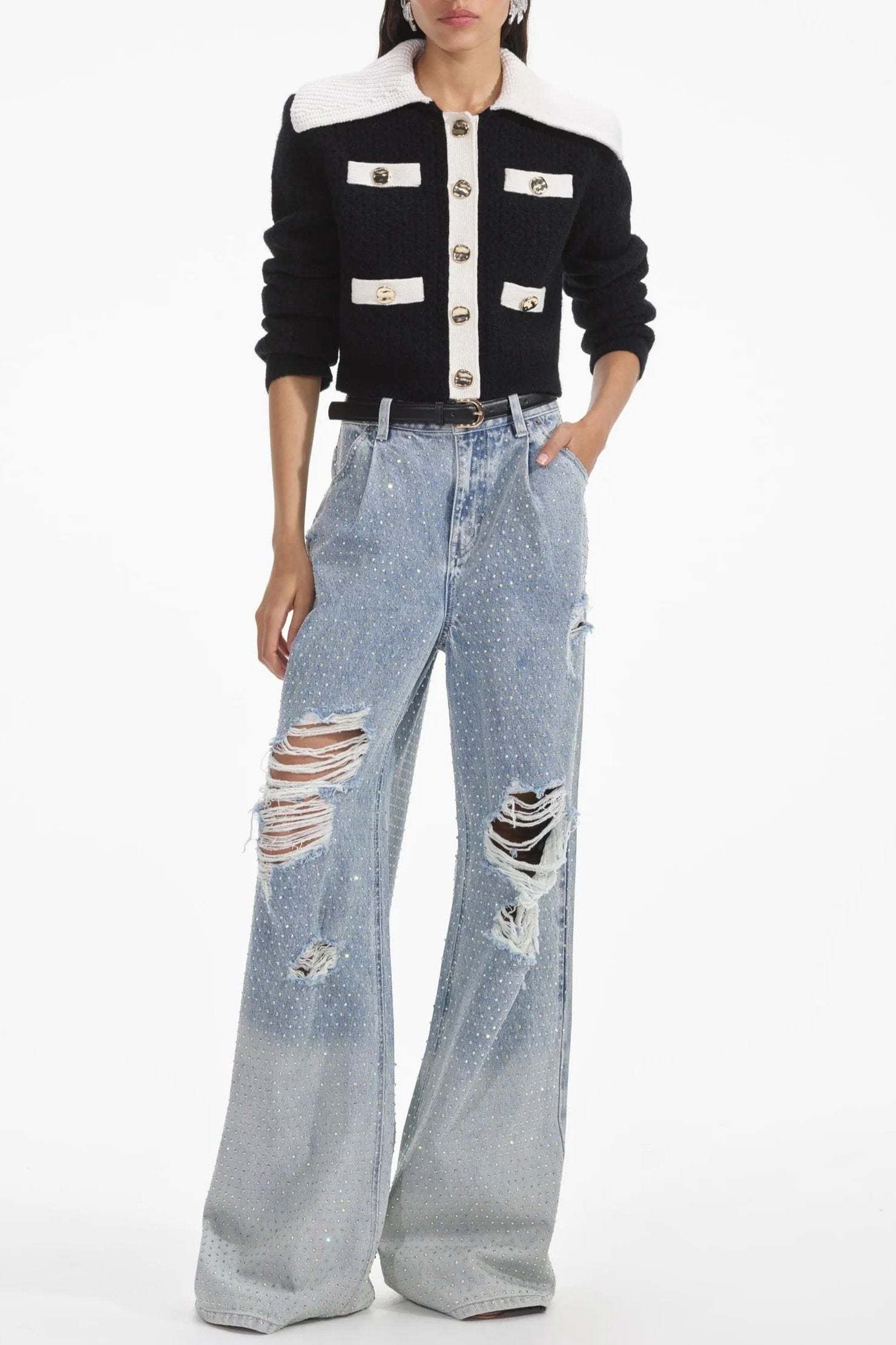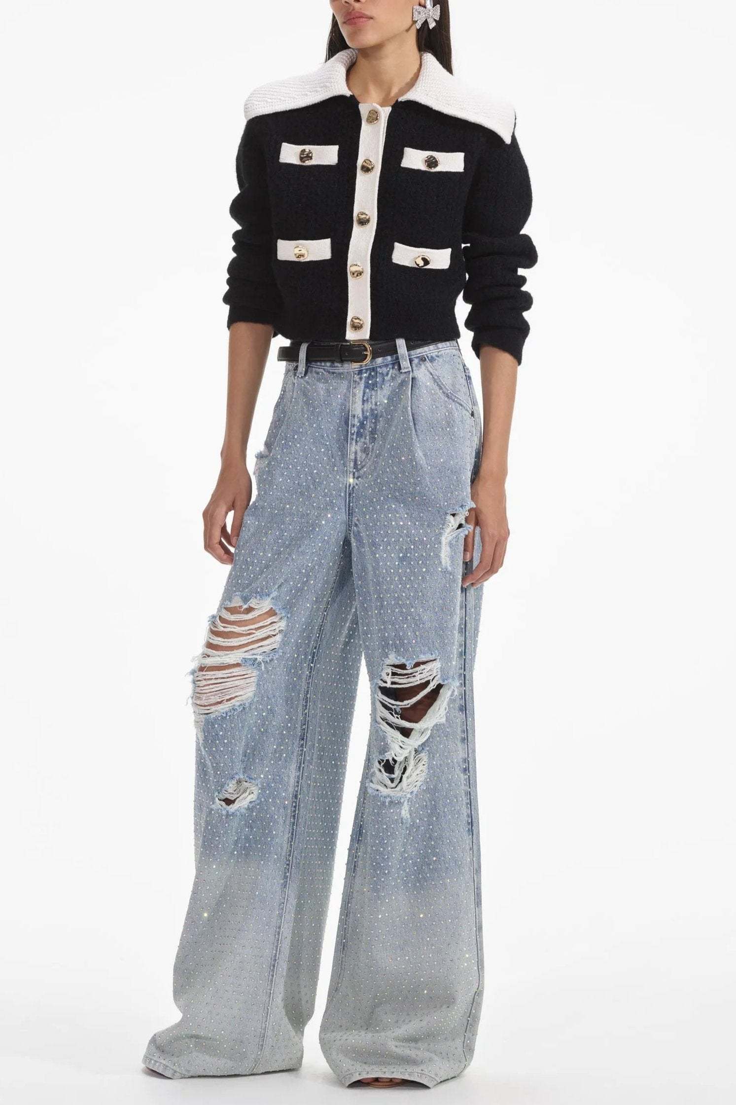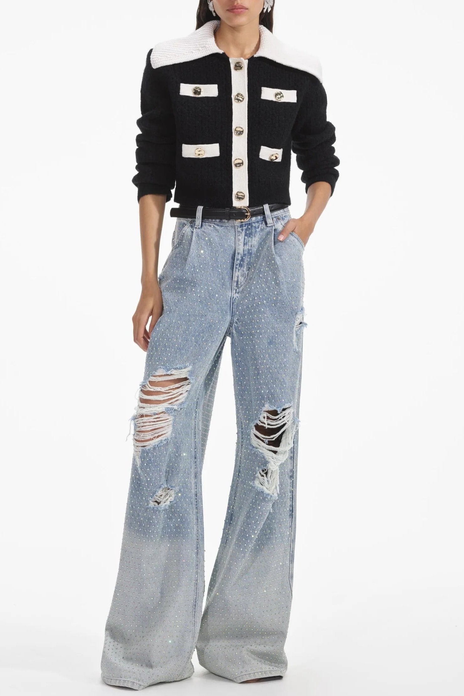 Preppy and polished with a playful spin, this lush cashmere blend cardigan stars a statement collar and ultra-flattering cropped cut. Match its gold buttons with our statement earrings for an effortless desk-to-dinner look.