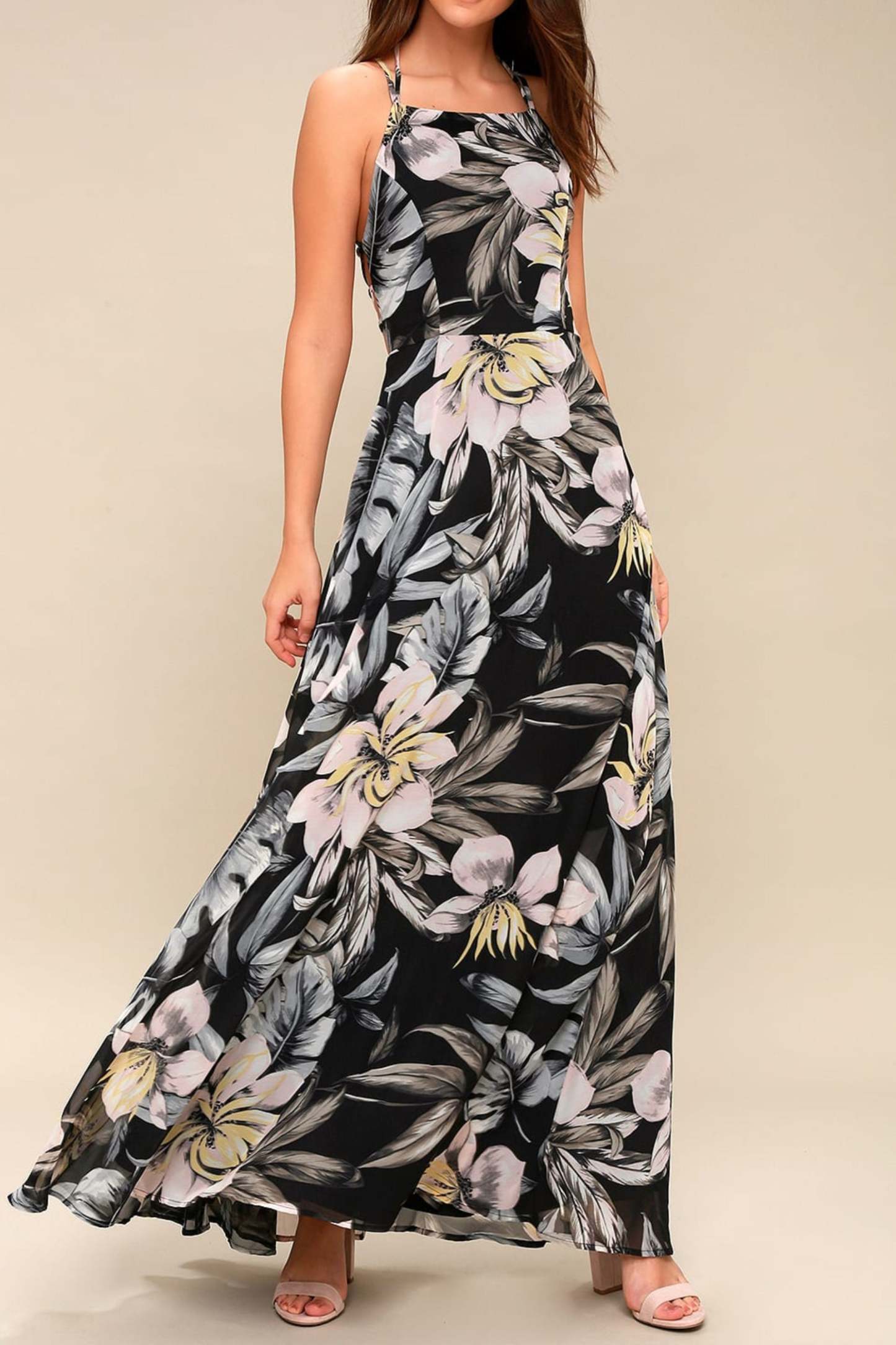 Expertly crafted with a black floral print and lace-up details, this maxi dress exudes elegance and sophistication. Made from high-quality materials, it offers both style and comfort. Perfect for any special occasion, this dress is a must-have in any fashion-forward wardrobe.