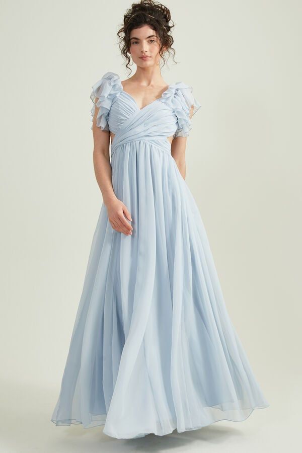 he Blair Maxi Dress is such a showstopper and perfect for your next big occasion! It has cups sewn into the chest which is ideal with the open back. The ruffle sleeves and lace up back are so fun and feminine. Pair this dress with your favorite heels and bag to complete the look.