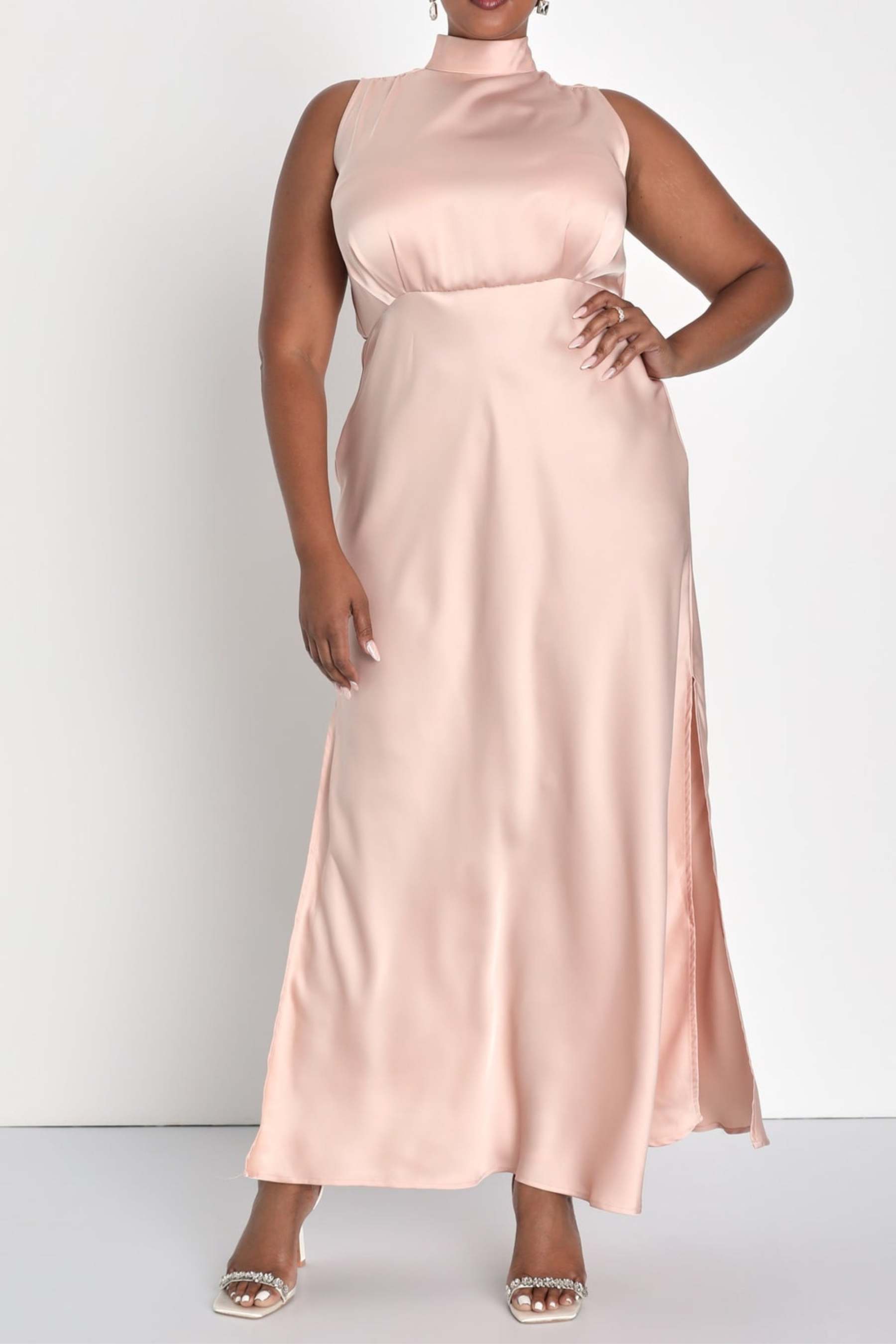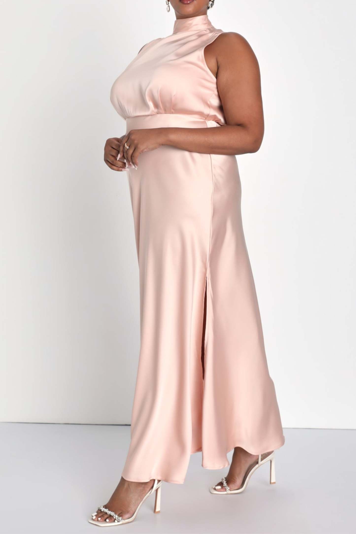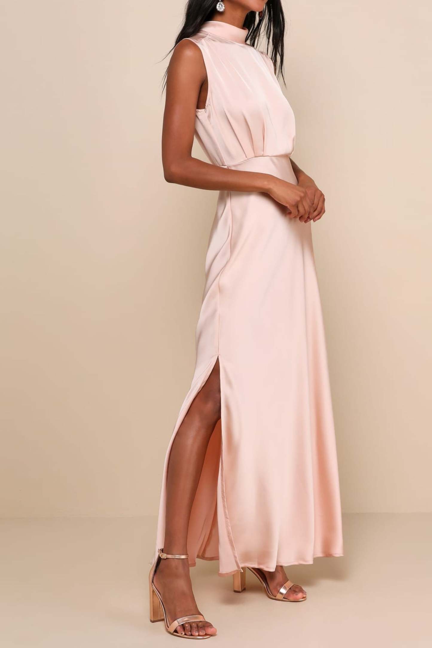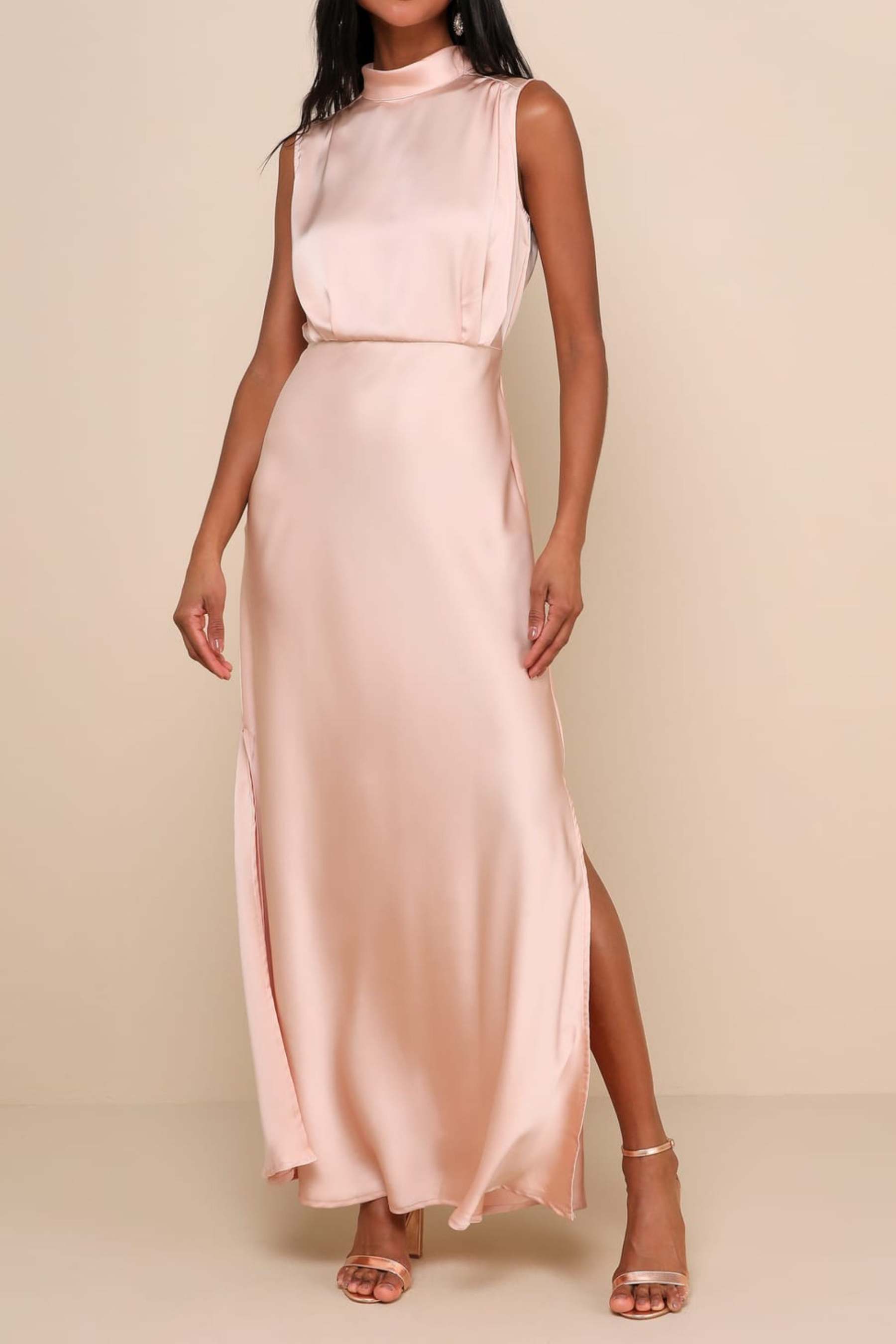 Blush Satin Sleeveless Mock Neck Maxi Dress