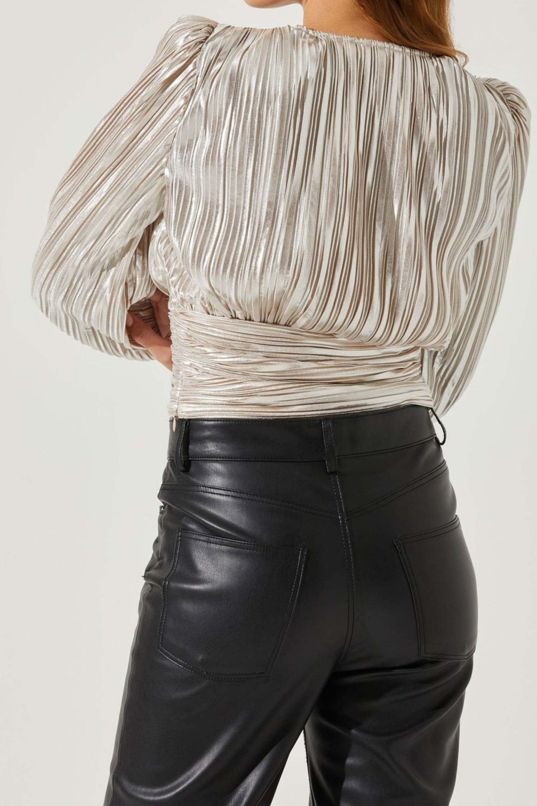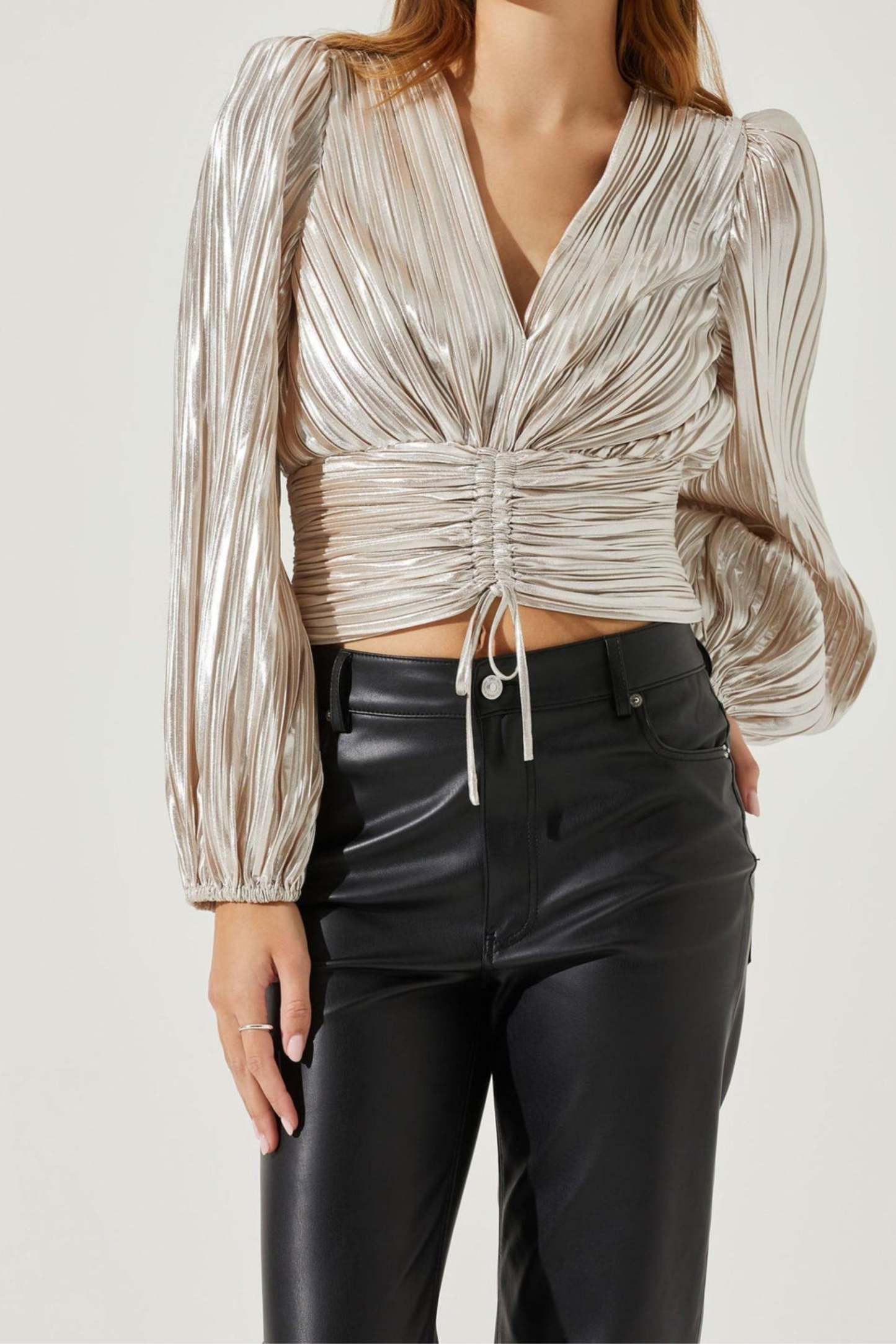 This Braydon Pleated Ruched Top is perfect for adding some sophisticated style to any outfit. The pleated design adds subtle texture, while the ruched detailing creates a flattering silhouette. Made with high-quality materials, this top is not only stylish but also durable. Elevate your wardrobe with this must-have piece.