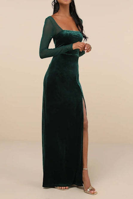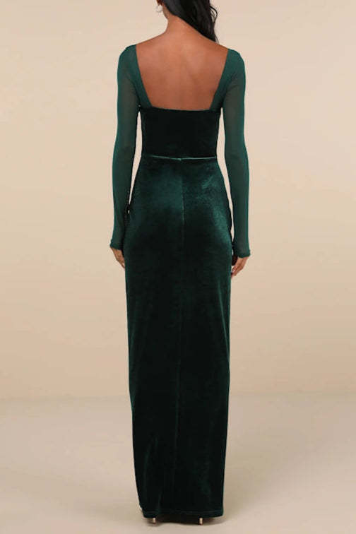 You can always depend on the Lulus Certifiably Chic Emerald Velvet Mesh Long Sleeve Maxi Dress to make you the most glamorous person in the room! This luxe velvet dress starts with a darted bodice and square neckline, framed by sheer mesh long sleeves. The fitted waist tops a column skirt that'll flaunt your figure perfectly as it falls to a maxi hem with a flirty side slit.