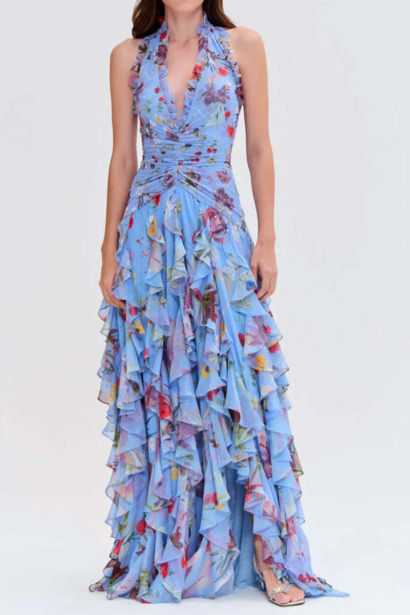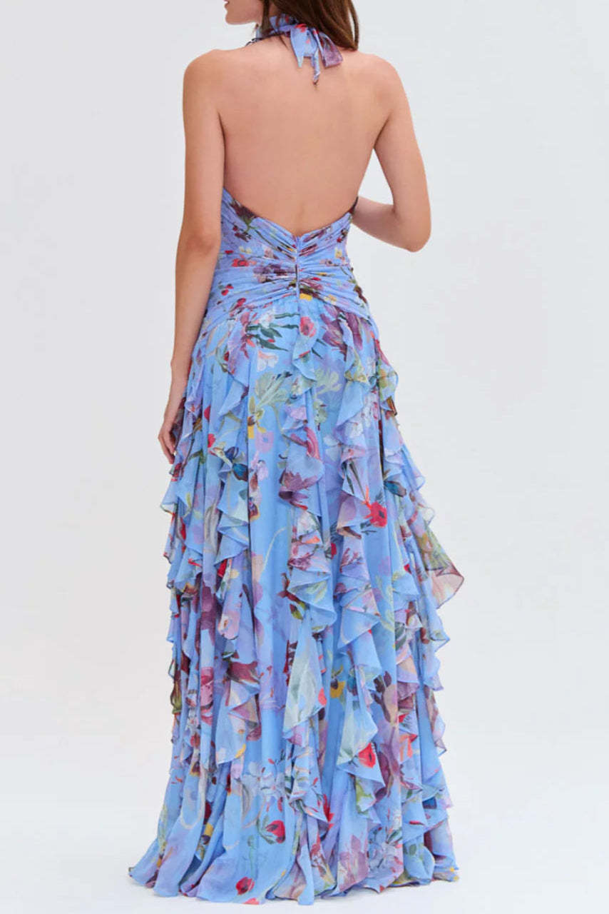 Indulge in elegance with our Floral Halter Ruffle Tulle Maxi Dress. This exquisite dress features a beautiful halter neckline, delicate ruffle details, and flowing tulle fabric, creating a stunning silhouette that will make you feel like a work of art. Elevate your style and make a statement with this luxurious piece.