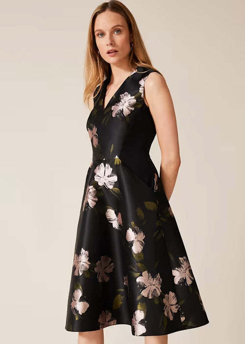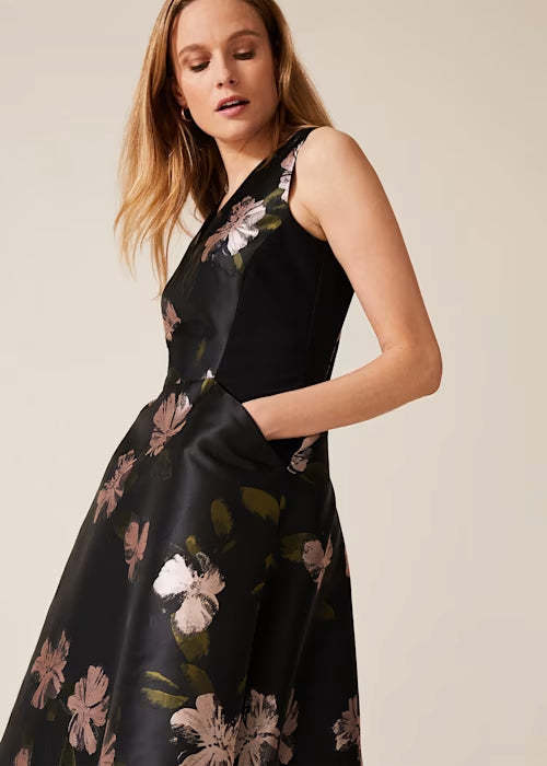 Elevate your style in this stunning floral jacquard midi dress in black. Designed with intricate floral details in a flattering midi length, this dress combines elegance and sophistication. Perfect for any occasion, feel confident and stylish in this must-have wardrobe piece.