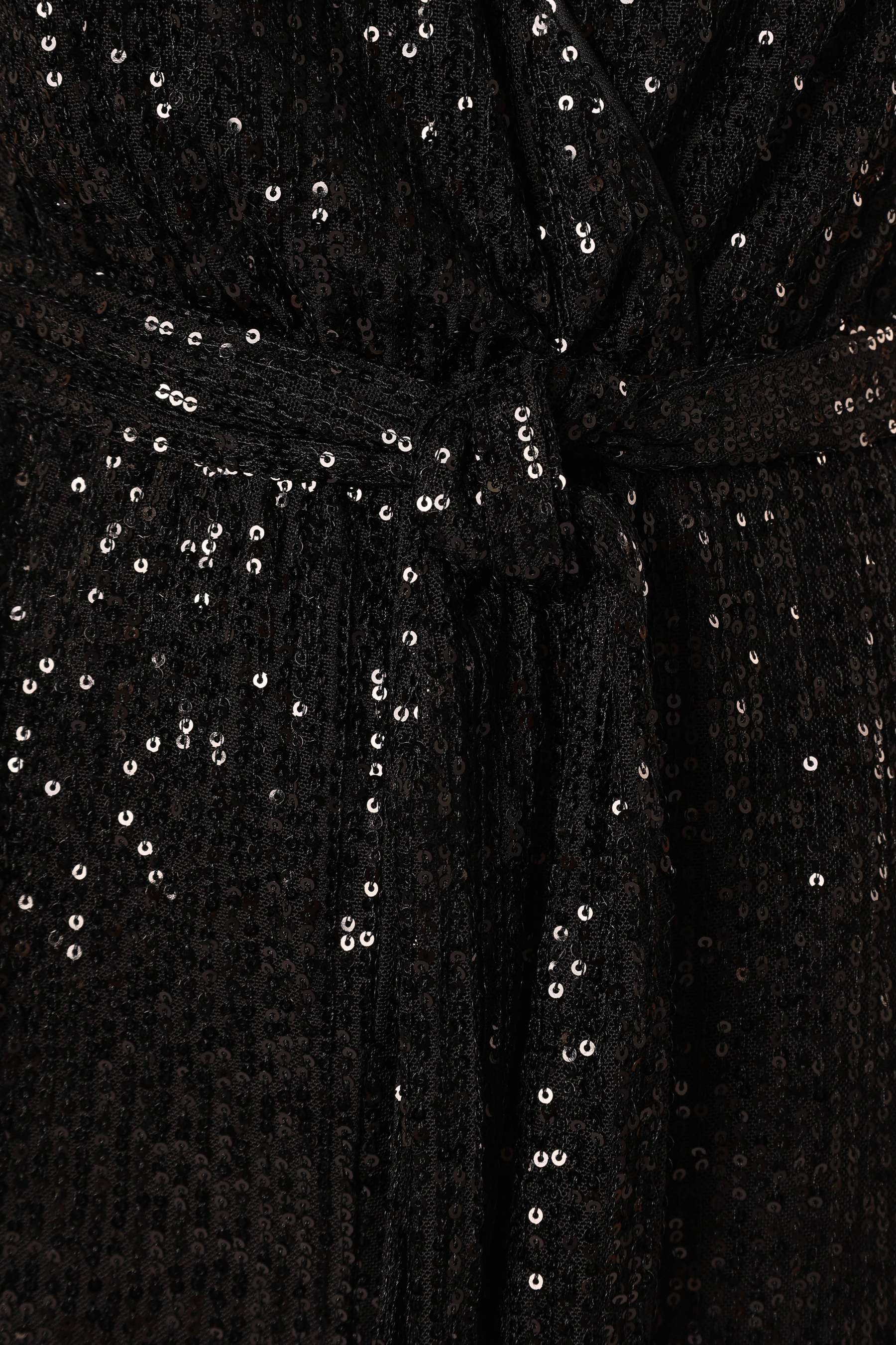 Our maxi length jumpsuit has a v overlay neckline, sleeveless design and a waist tie close belt to flatter your silhouette. Plus, it comes complete with pull on design with clasp easy access and is made from stunning sequin material to help you.