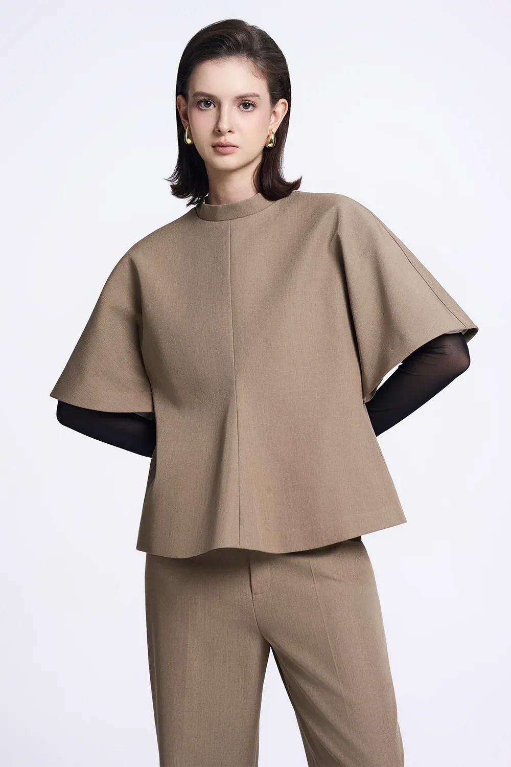 The top features elegantly wide sleeves and a refined mock neck, offering a sophisticated silhouette that balances comfort and style. Crafted from durable twill fabric, this top provides structure while maintaining ease of movement, making it ideal for both professional and casual settings. Its clean lines and thoughtful design ensure a polished look with effortless wearability.
