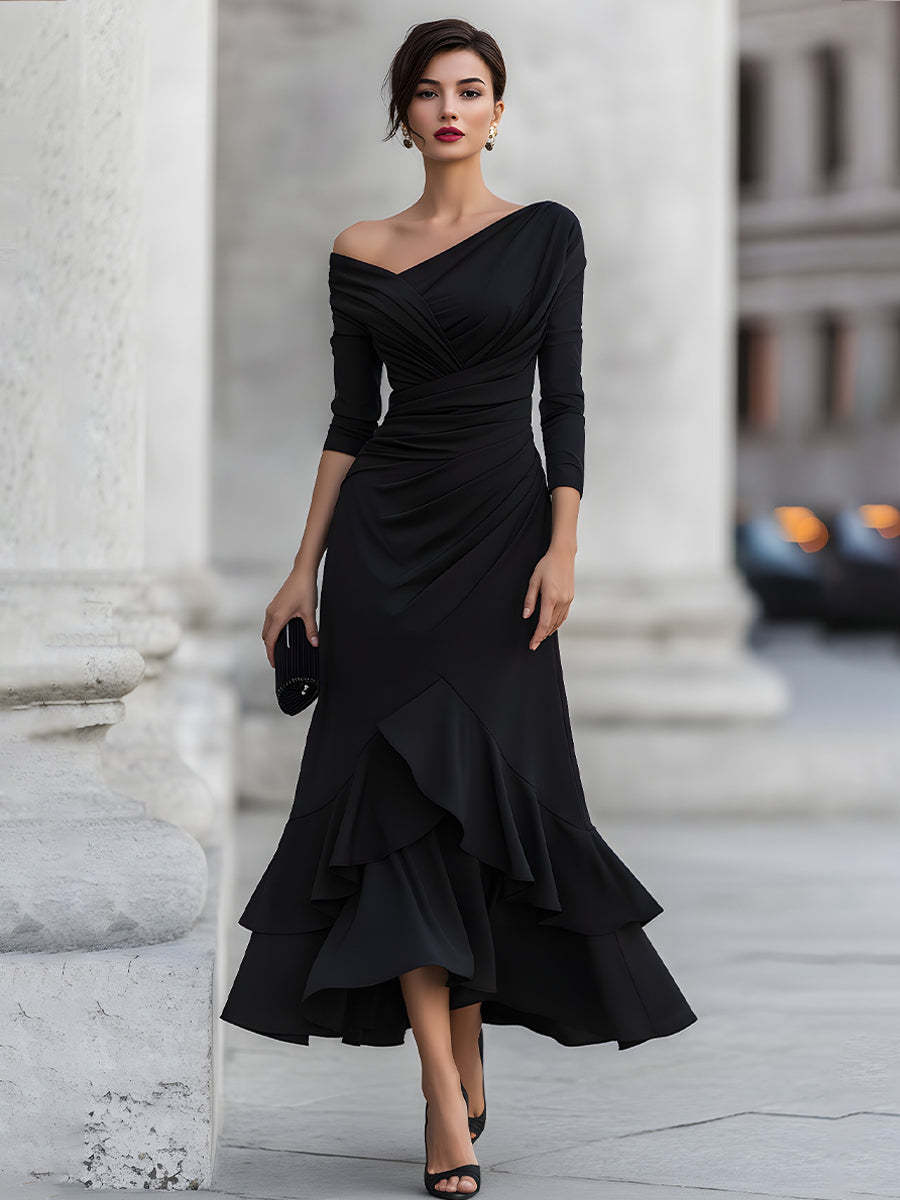 Mooyius presents a striking one-shoulder midi dress that embodies sculptural elegance and refined femininity. Designed with an asymmetrical neckline, this silhouette highlights the collarbone while creating a modern, confident presence. The bodice is artfully ruched, with diagonal pleating that wraps across the torso to contour the waist and enhance the natural shape. This precise draping adds depth and movement while maintaining a clean, polished appearance. The fitted upper flows into a softly flared skirt, finished with a layered asymmetric ruffle hem that brings graceful motion with every step. The three-quarter sleeve on one side balances the exposed shoulder, delivering a distinctive yet sophisticated visual contrast. Carefully tailored to flatter from every angle, this dress is designed to transition effortlessly from formal daytime occasions to elegant evening events.
