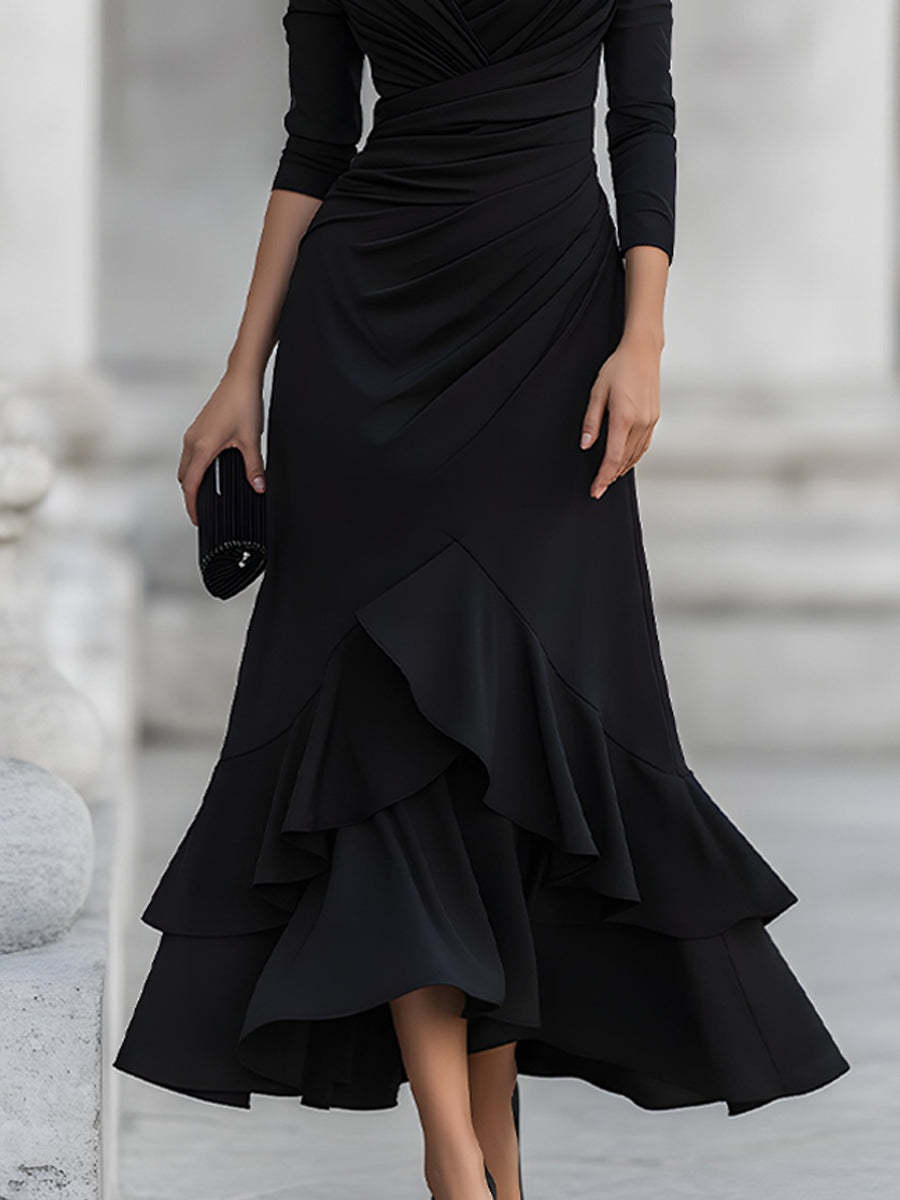 - Design: One-shoulder asymmetric neckline, diagonal ruched bodice, three-quarter sleeve, fitted waist, layered ruffle hem, midi length