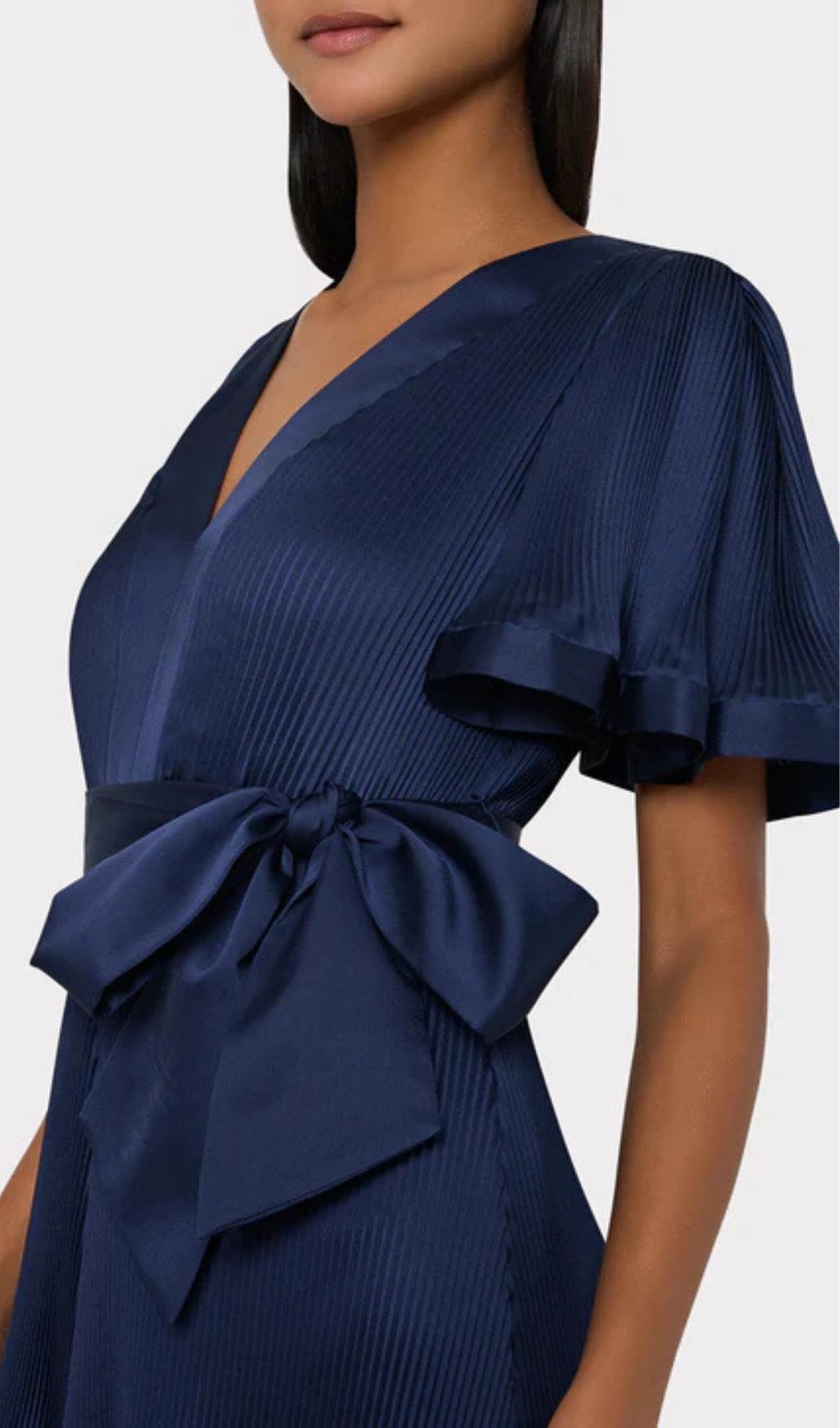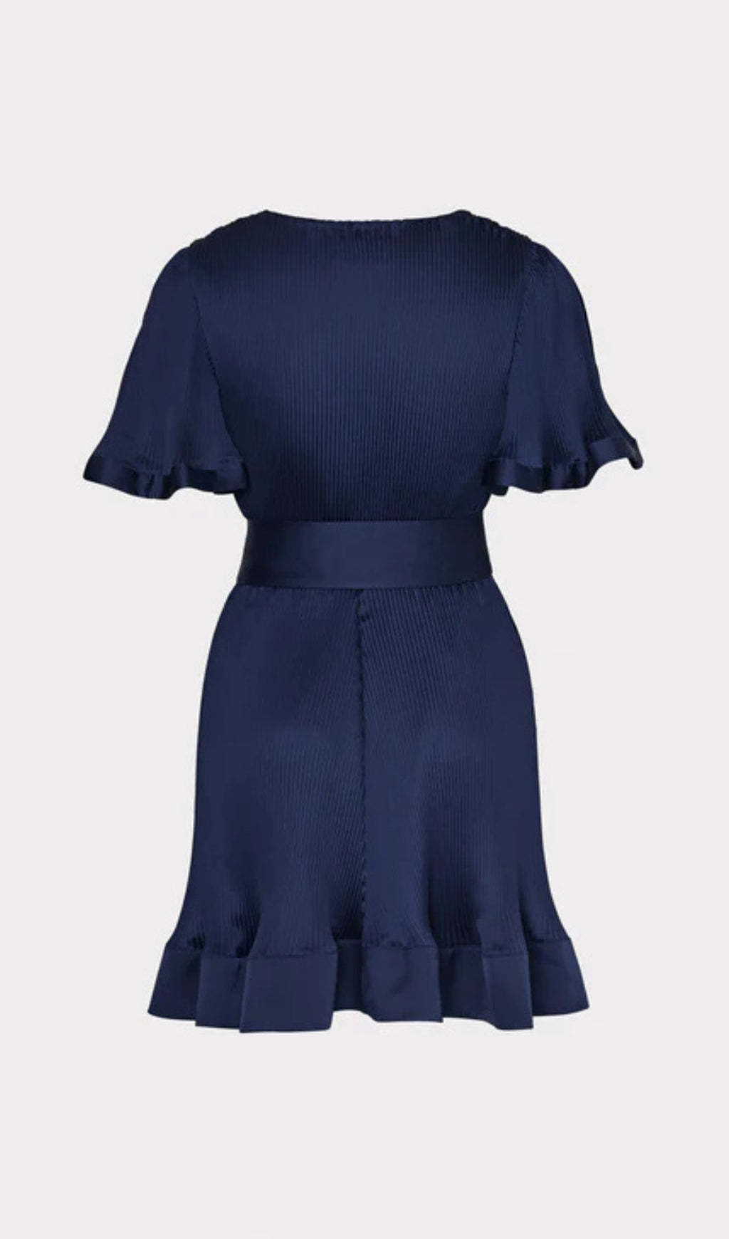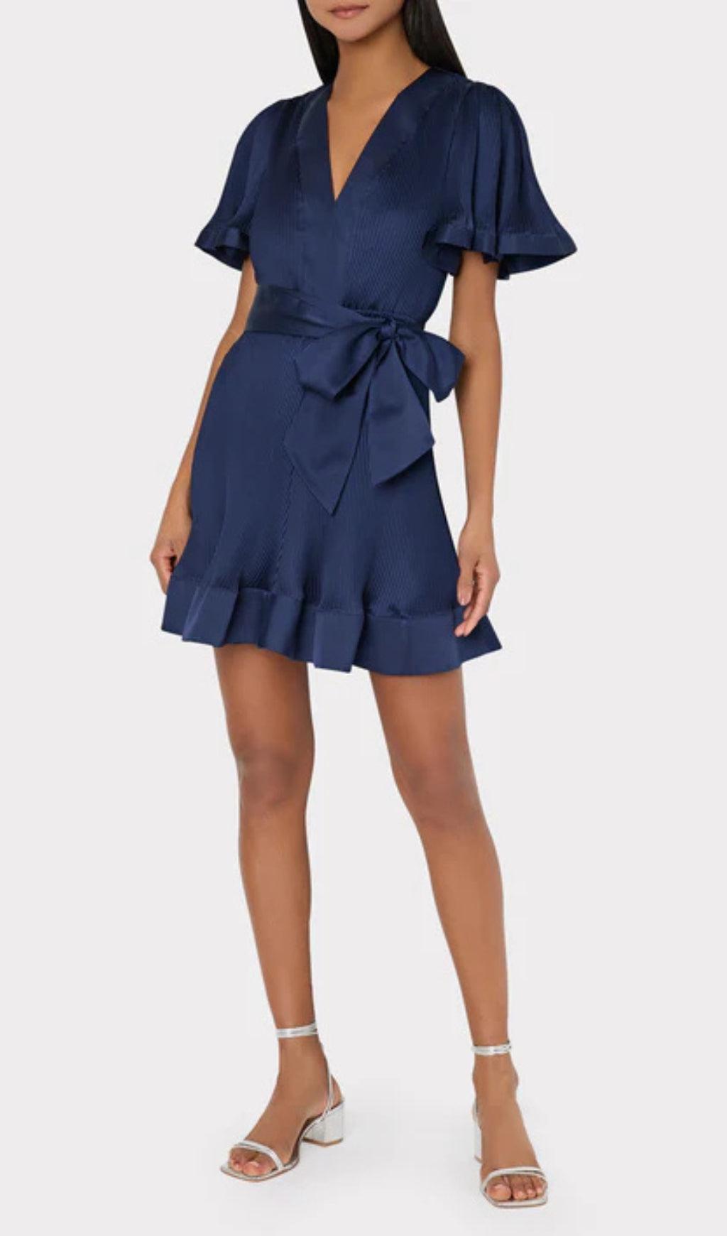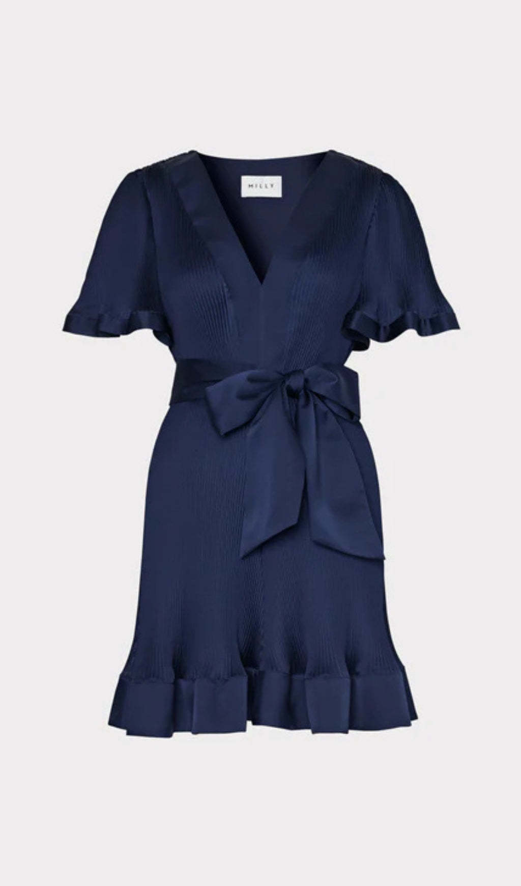 Our latest mini dress style is headed right for our best-sellers list. Done in our luxe satin fabric with signature MILLY pleating, it features a plunging v-neckline, a flouncy flutter sleeve, and is finished with a waist-cinching tie. Take your Ellie dress for a night out with a pair of high heels and a fun clutch.
