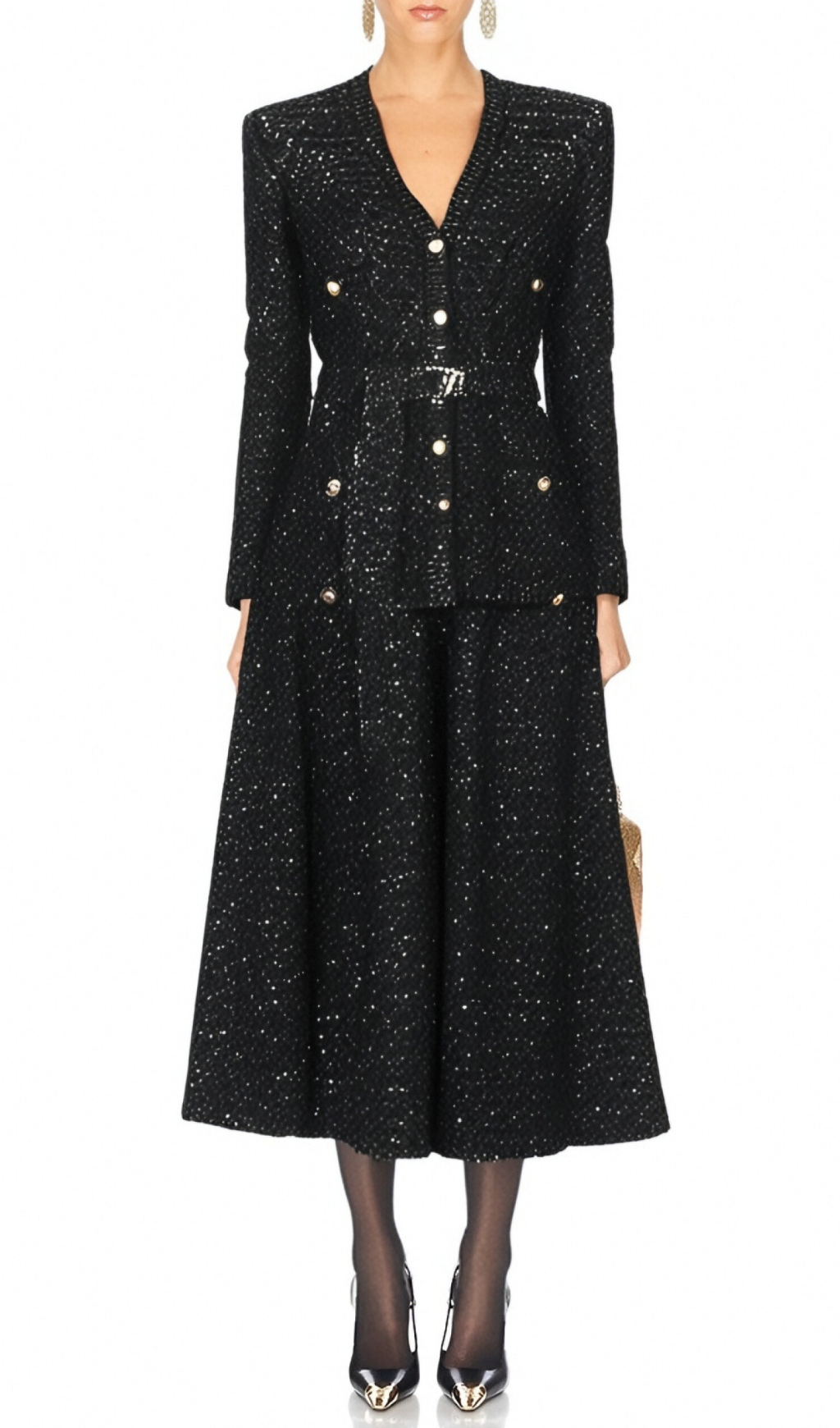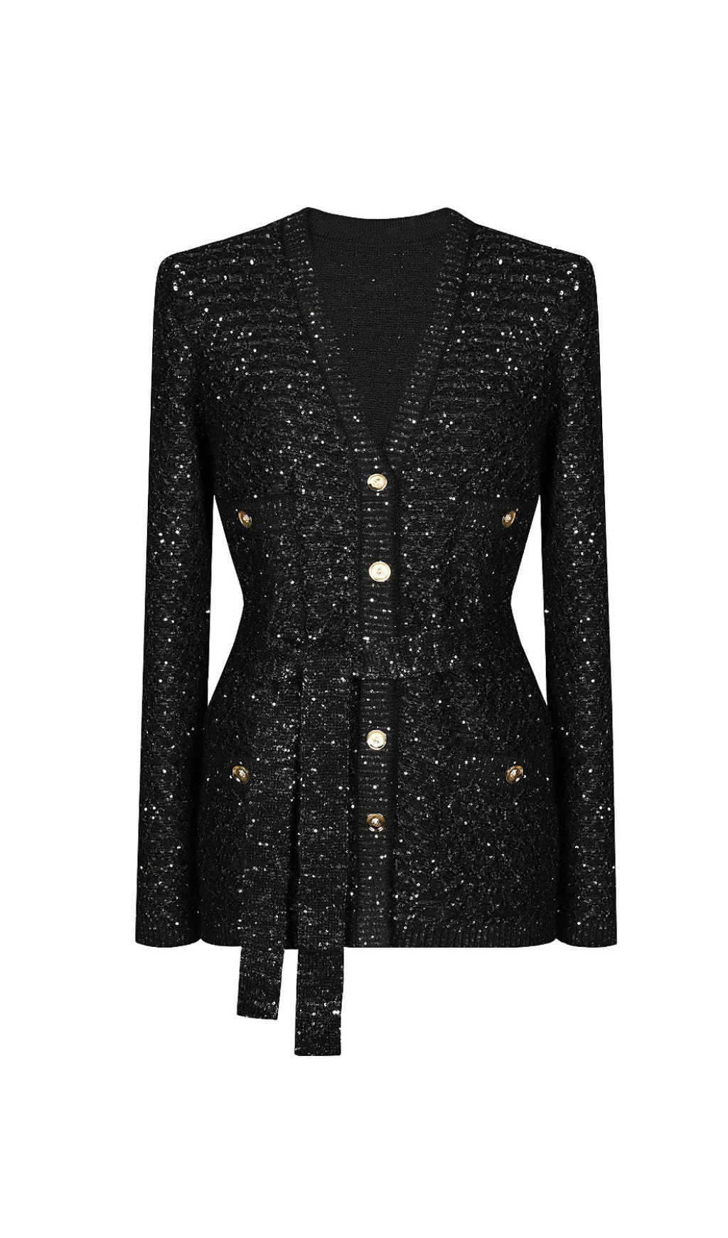 Upgrade your wardrobe with our stylish sequin knit v-neck cardigan in black. This versatile piece features a flattering v-neckline and intricate sequin knit detailing, adding a touch of glamour to any outfit. Made with high-quality materials, it's perfect for any occasion.