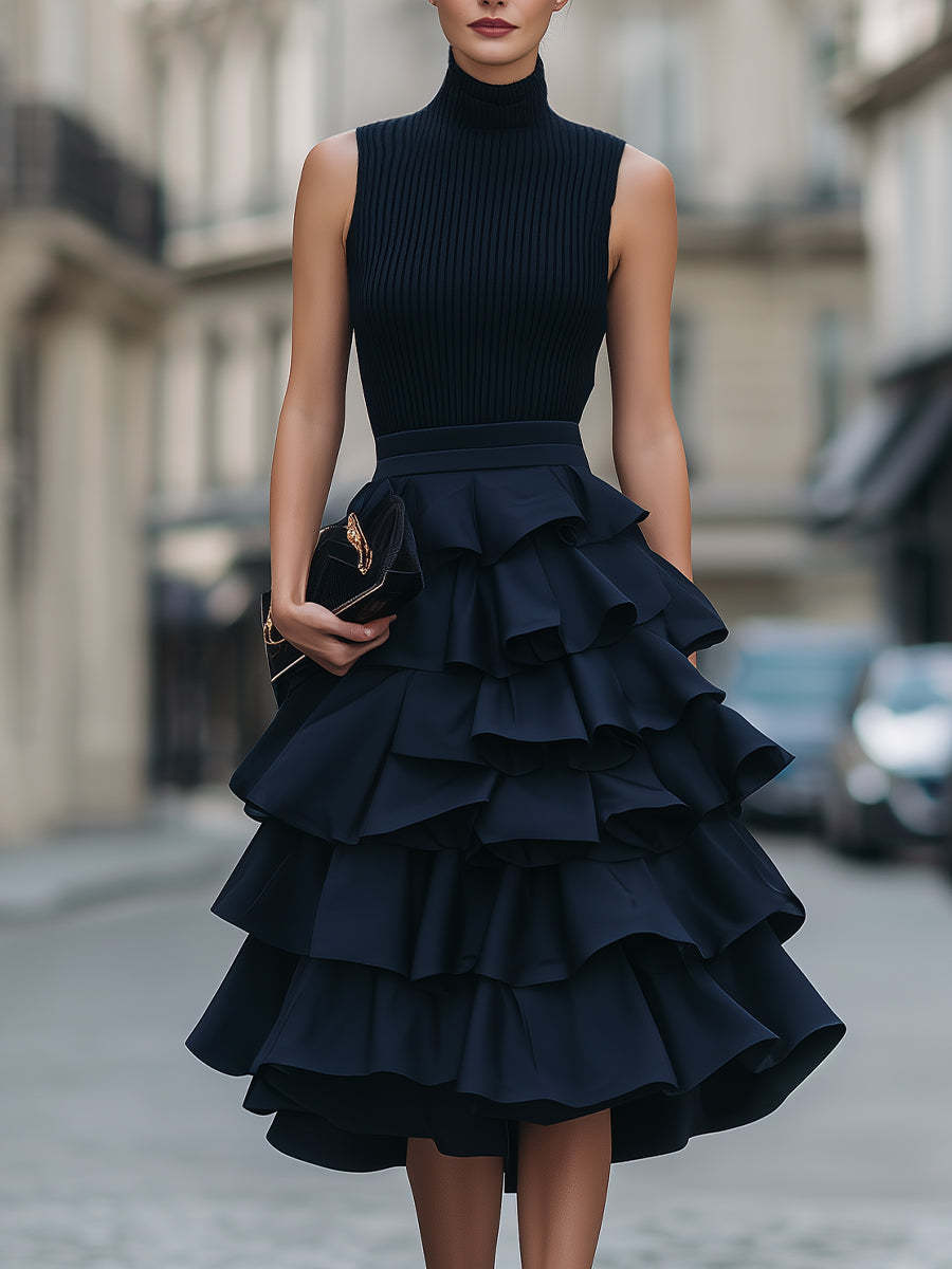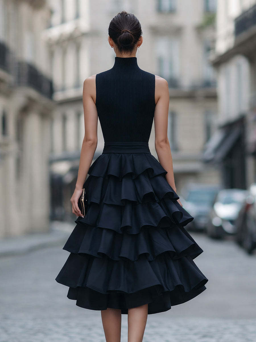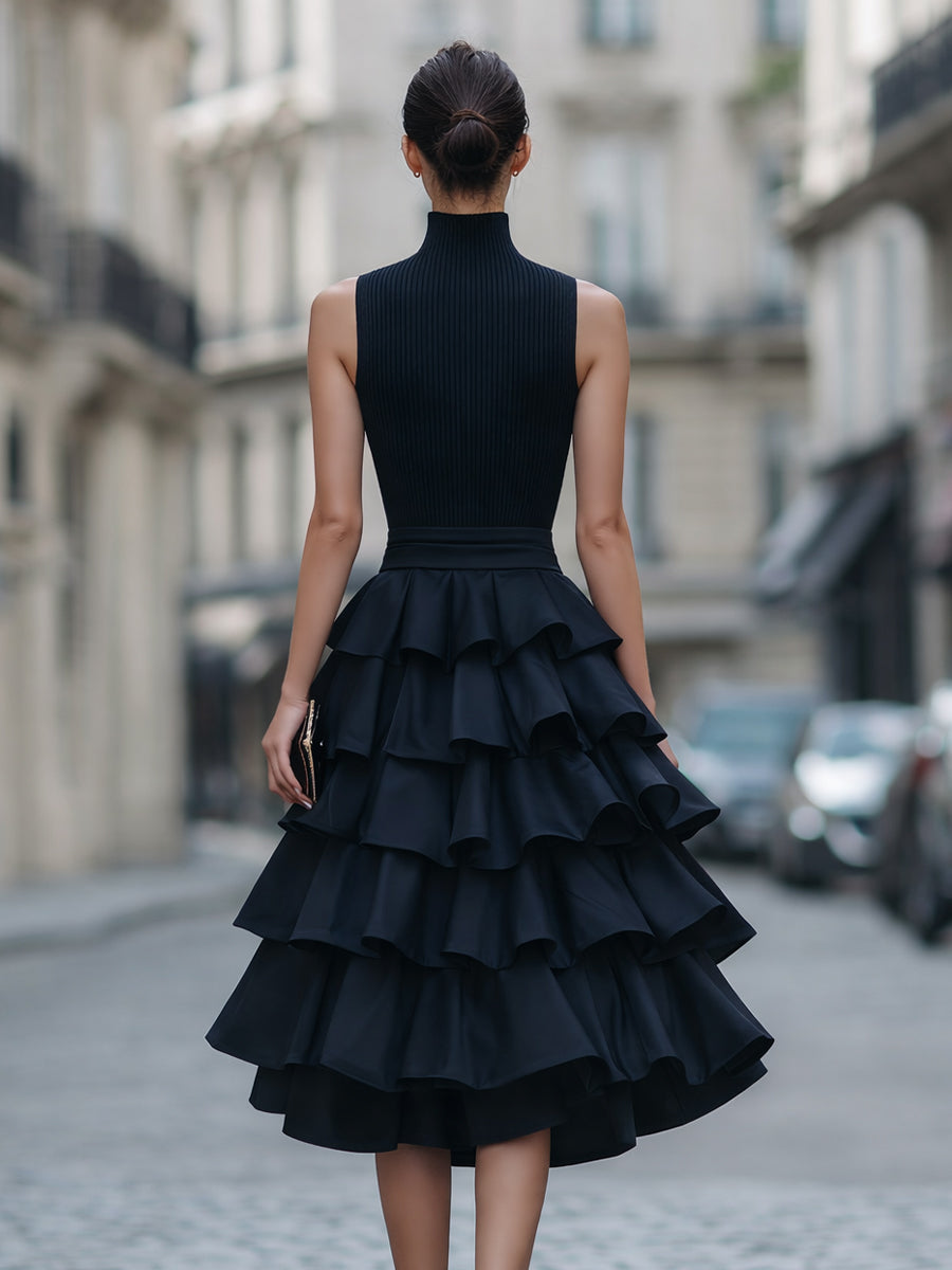 - Design: Sleeveless high neckline, ribbed-inspired fitted bodice, defined waist seam, multi-layer tiered ruffle midi skirt, and sculptural feminine silhouette
