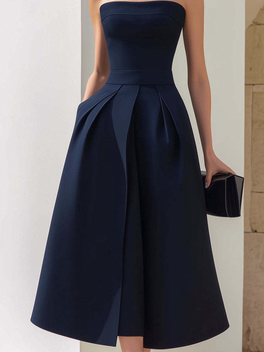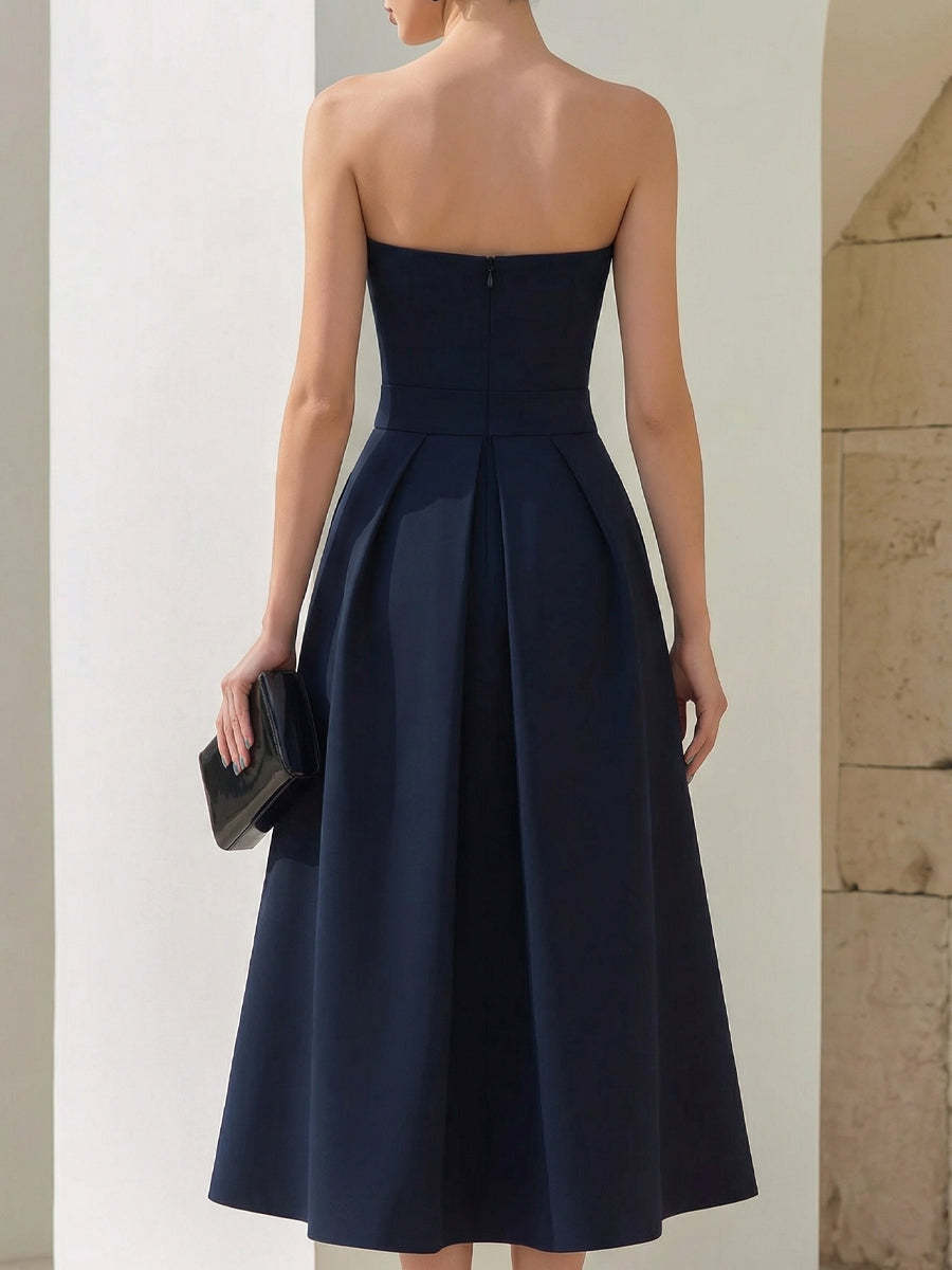 Designed to embody timeless sophistication and sculptural elegance, this strapless midi dress delivers refined structure with modern femininity. The clean architectural lines and voluminous skirt create a dramatic yet balanced silhouette, perfect for formal occasions and elevated evening wear.The strapless neckline is softly contoured to frame the collarbone and shoulders with understated grace. Its structured bodice is carefully tailored to sculpt and support, creating a smooth, defined upper silhouette while enhancing natural curves. The fitted waistline transitions seamlessly into a full pleated skirt, where deep inverted pleats introduce dimension, movement, and couture-inspired volume.