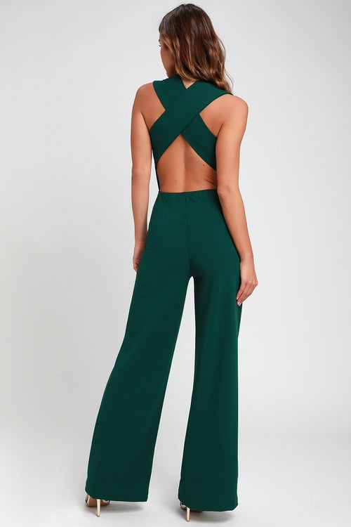 Your admirers will have a lot to say about their love for you in the Thinking Out Loud Hunter Green Backless Jumpsuit! Medium-weight crepe knit forms a sleeveless darted bodice with a V-neck and wide straps that cross over the open back. Bit of elastic at the waist tops the wide-leg pants.