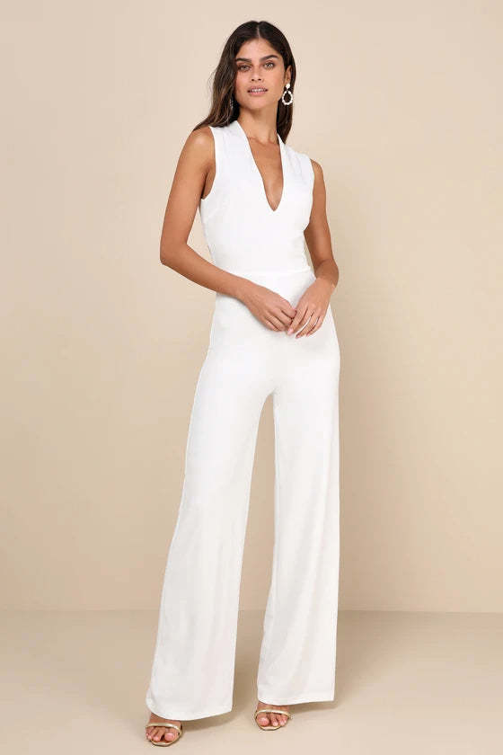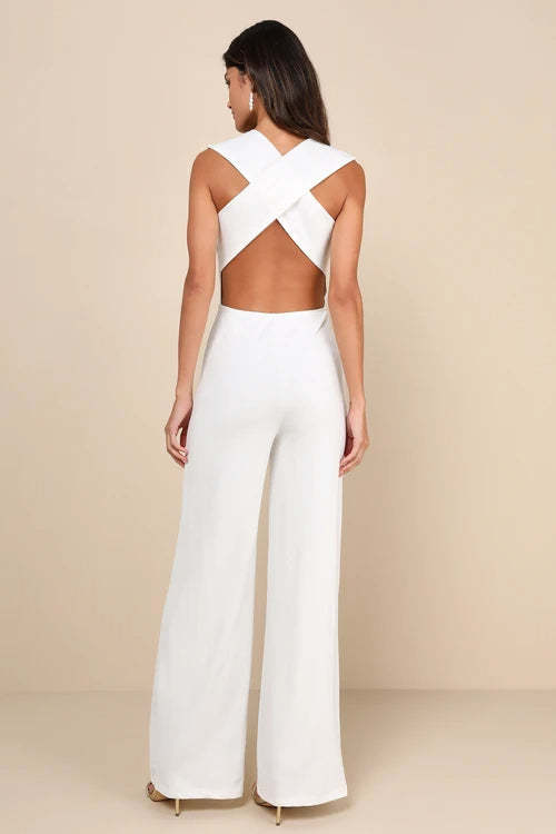 This easy-wearing jumpsuit gives effortless glamour as it flaunts a plunging, sleeveless bodice with wide straps that crisscross the sexy backless design. The wide-leg silhouette completes the sleek and stylish silhouette. Elastic at back.