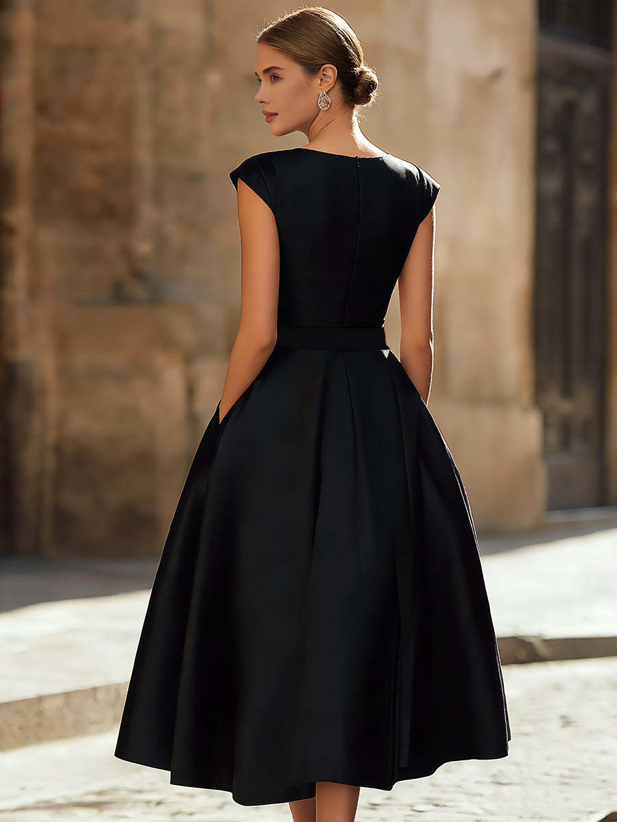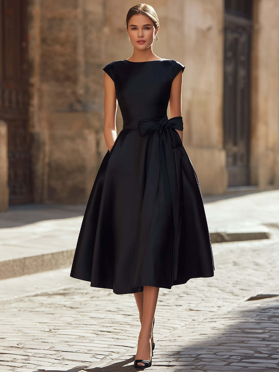 Elevate your wardrobe with this quintessential little black dress, a masterpiece of sophisticated tailoring and mid-century charm. Designed for the woman who appreciates classic silhouettes with a modern edge, this dress features a stunning boat neckline and delicate cap sleeves that frame the shoulders beautifully. The structured bodice gives way to a cinched waist, accentuated by a dramatic, oversized bow that adds a touch of playful haute couture.