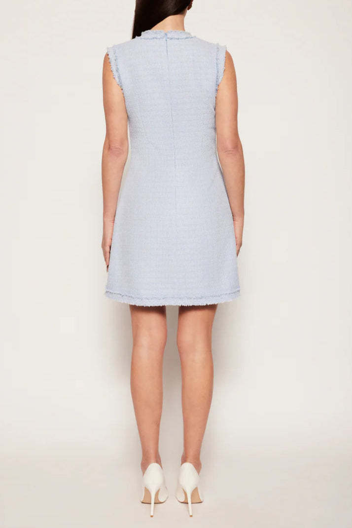 This blue tweed sleeveless mini dress combines classic texture with a modern silhouette, offering a refined yet youthful look. Its tailored fit enhances your shape while the sleeveless design ensures comfort and ease of movement. Ideal for both professional settings and stylish social occasions, this dress delivers timeless elegance with a contemporary edge.