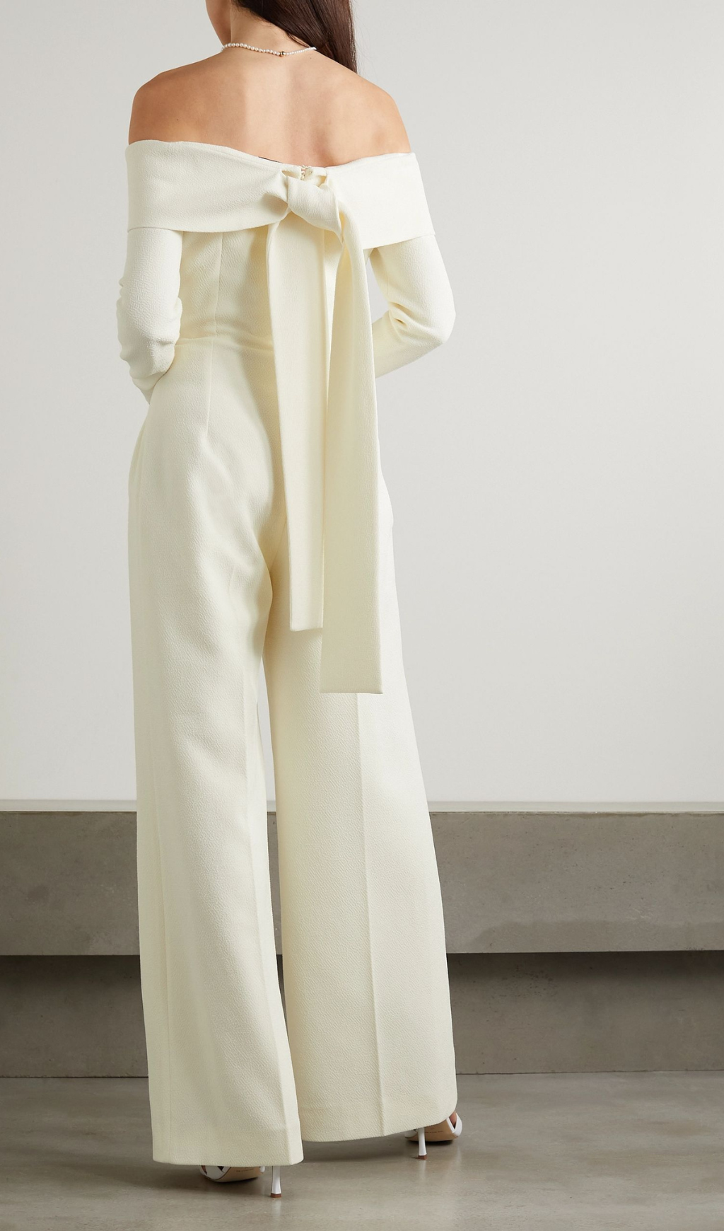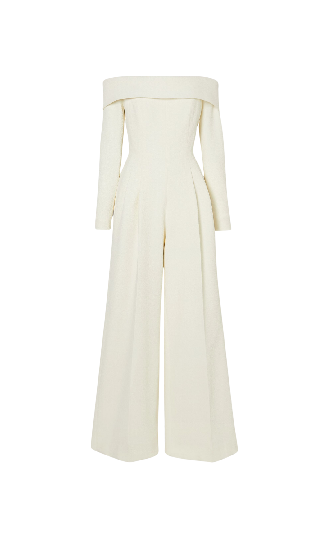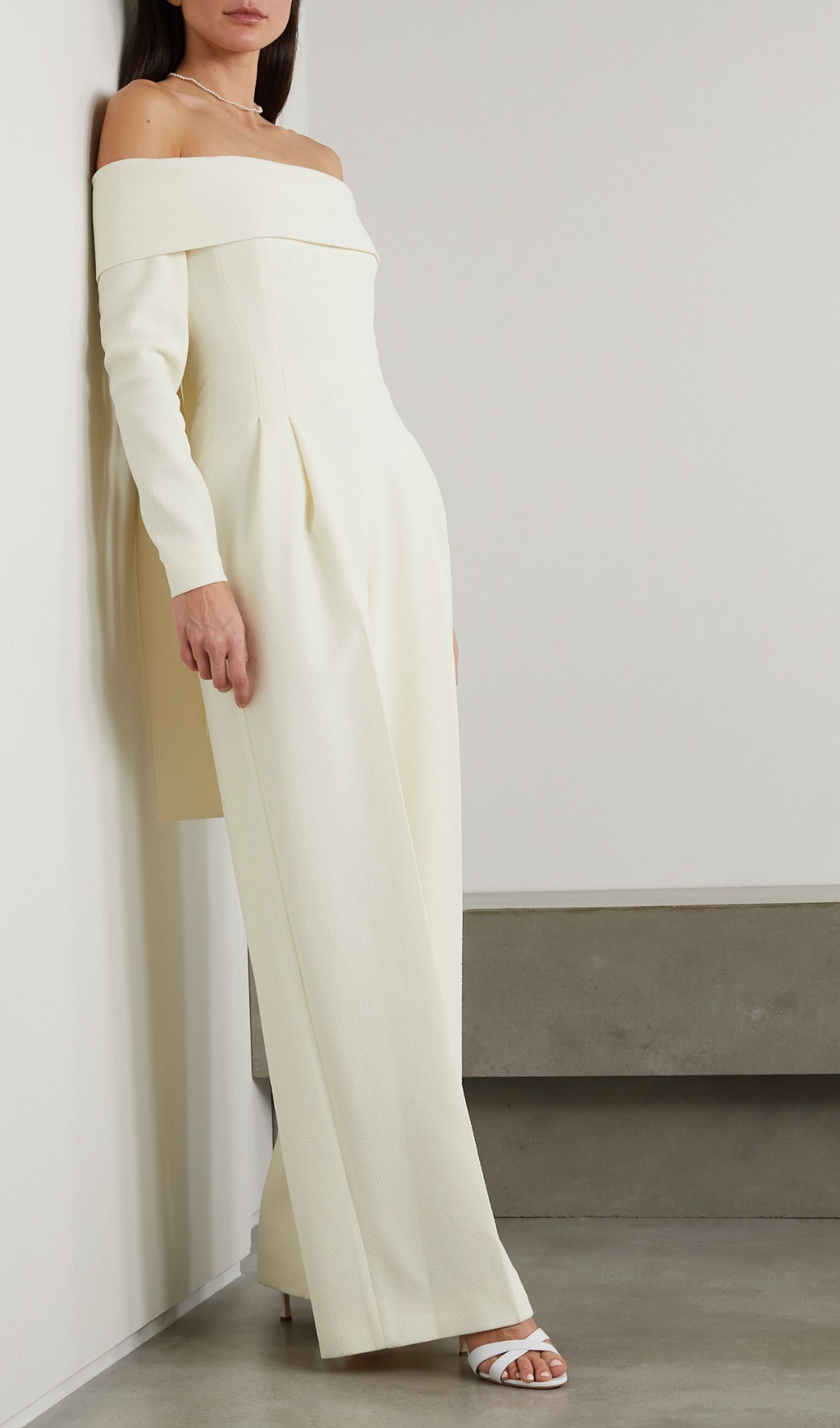 Expertly crafted from light, airy crepe fabric, the Vesper off-the-shoulder jumpsuit in ivory is a must-have for any wardrobe. The elegant off-the-shoulder neckline adds a touch of sophistication, while the wide leg design elongates the silhouette. Perfect for a night out or a special event.
