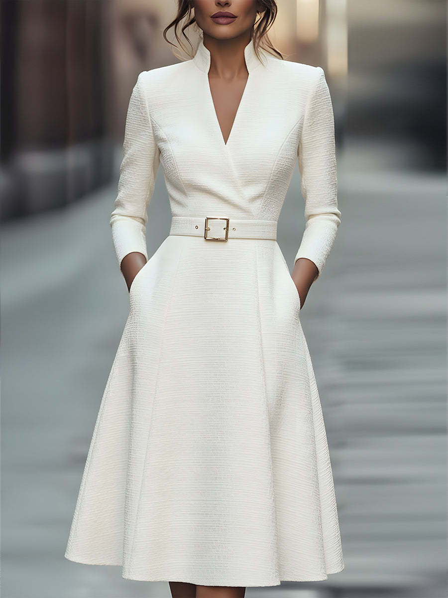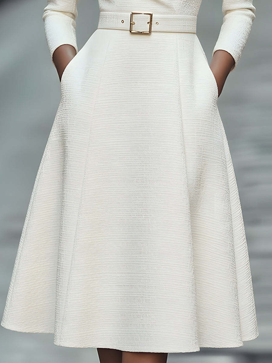 This white textured dress exudes timeless sophistication. Featuring a structured V-neckline and long sleeves, the dress is enhanced by a matching belt with a sleek gold buckle that cinches the waist for a flattering fit. The pleated skirt adds an elegant flow, creating a classic A-line silhouette.
